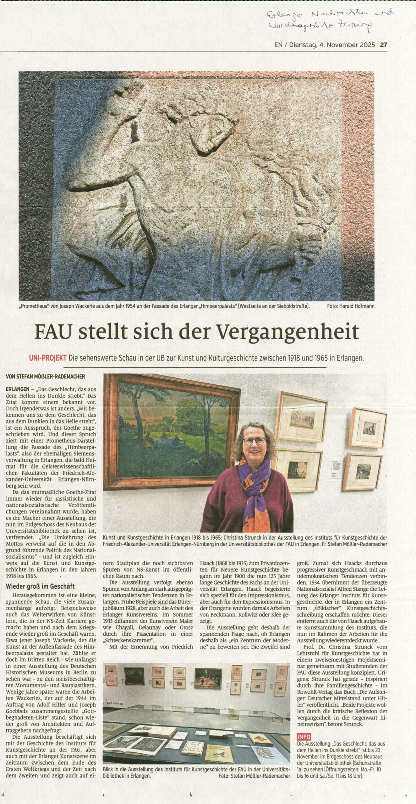 - Virtuelle Ausstellung (mit Studierenden der FAU Erlangen-Nürnberg): Das Geschlecht, das aus dem Hellen ins Dunkle strebt. Kunst und Kunstgeschichte in Erlangen, 1918 bis 1965; Ausstellungsbesprechungen in der Nordbayerischen Zeitung und den Erlanger Nachrichten, 4.11.2025 sowie in der Nürnberger Zeitung, 11.11.2025